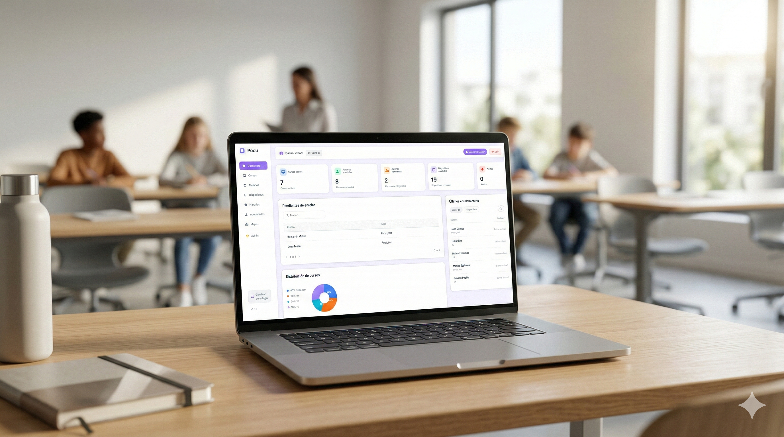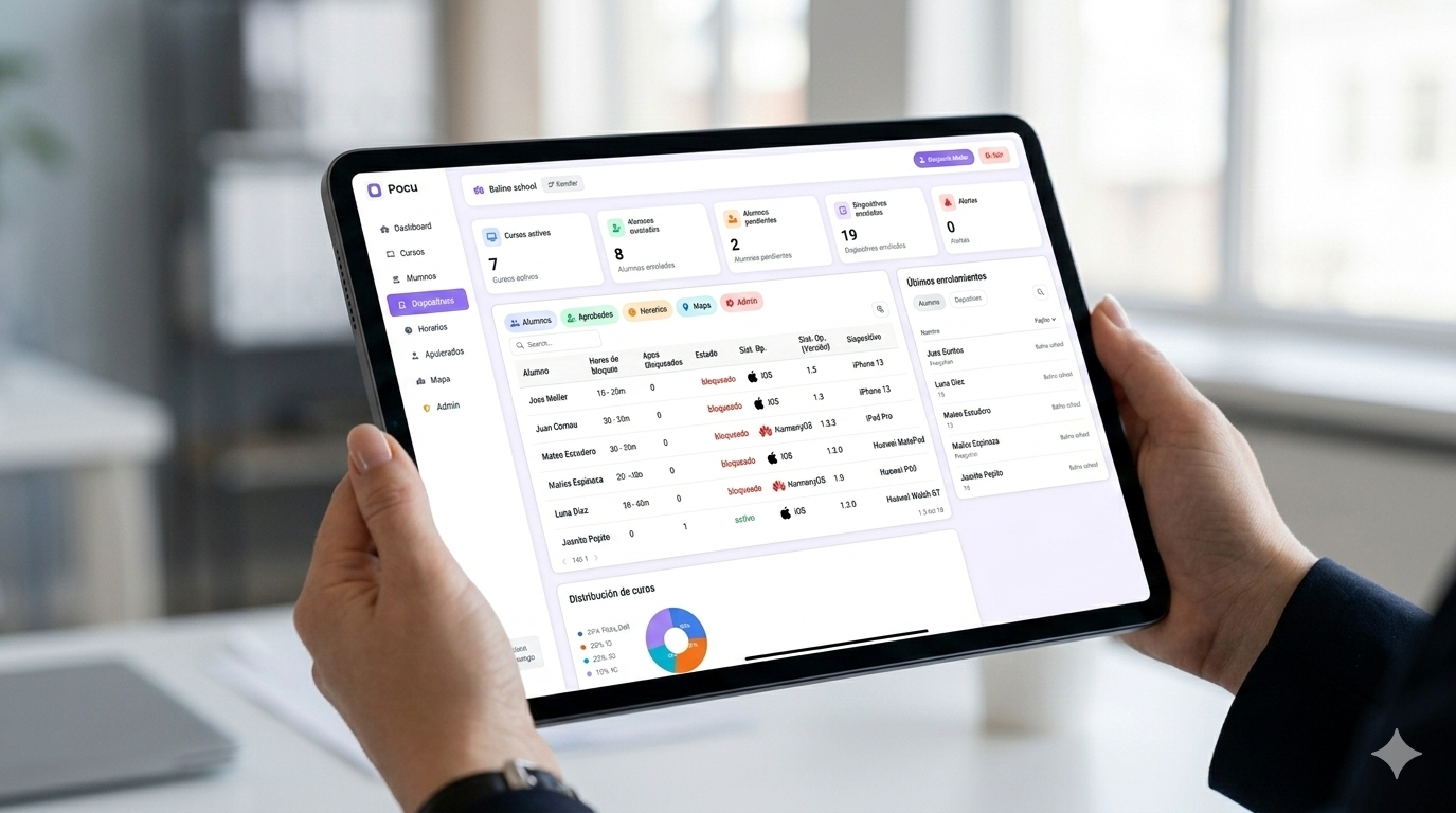 Cumple la Ley 21.801 sin quitar teléfonos, sin cajas de madera y sin peleas en la sala. POCU gestiona las distracciones de forma remota y automática